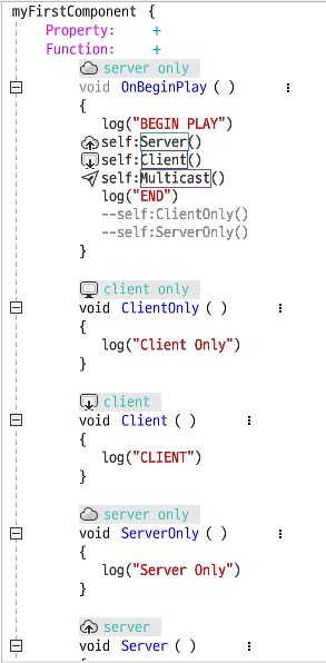 - ServerOnly : 서버에만 불릴 수 있고, 클라이언트에서는 부를 수 없다. 대부분의 로직는 서버에서 서버 기준으로 짜게 된다. 즉, 로직은 주로 서버 위주의 행위를 많이 하게 됩니다.