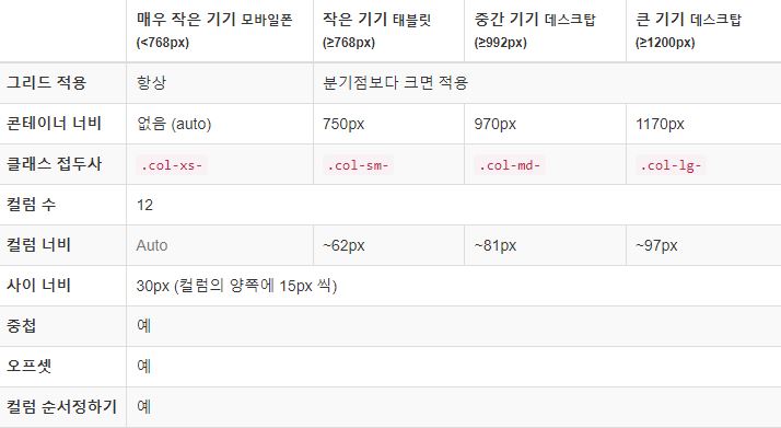 : Bootstrap의 그리드 시스템에서 사용하고 있는 칼럼의 클래스 종류는 기본적으로 4가지가 있으며, 각각의 종류 뒤에는 12칼럼 중 몇개의 칼럼을 사용할지 명시하여 사용하면 된다.