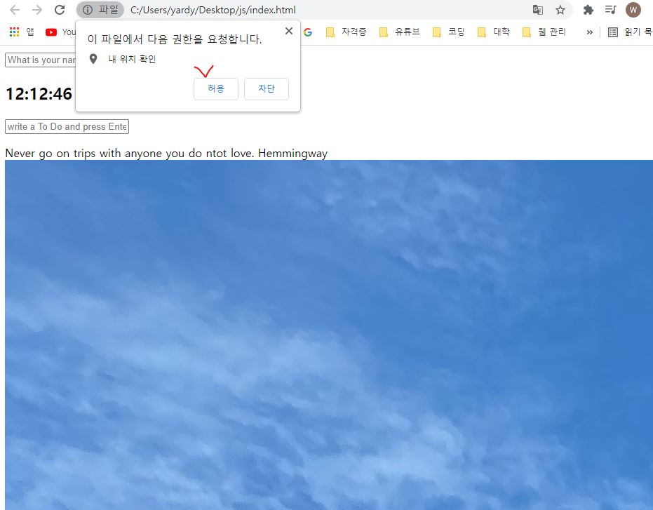 tip // navigator 함수는 첫번 째 인자로 위치를 받는데 성공했을 때의 함수를 받고, 두번째 인자로는 에러가 발생했을 때 실행될 함수를 받는다.